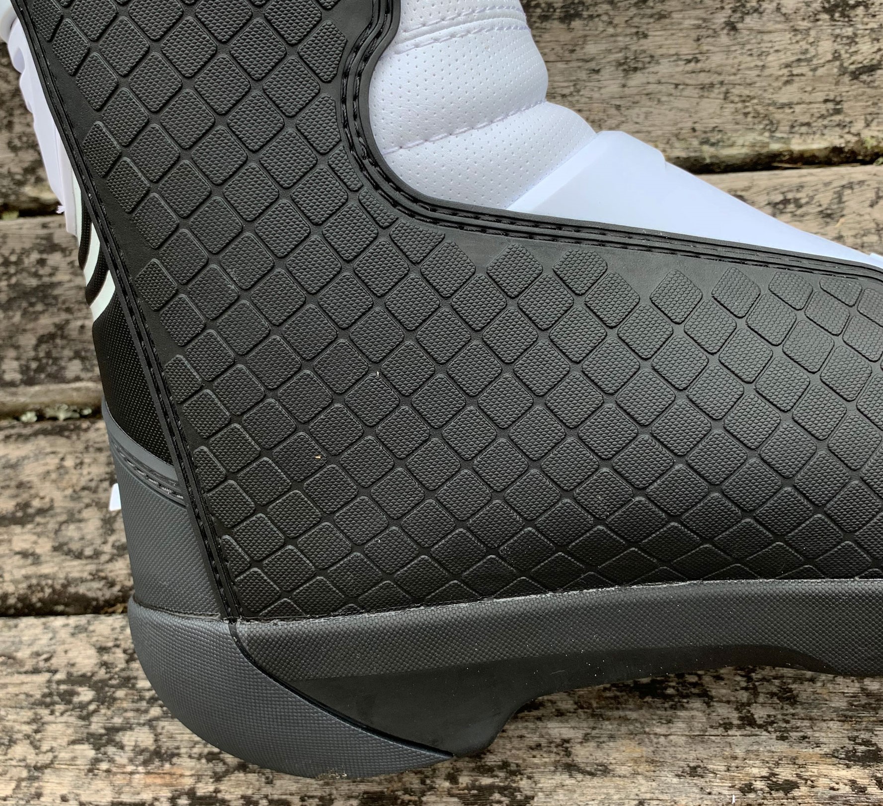 Com a construção externa voltada para melhor absorção de impactos, a região do tornozelo conta com composição em TPU (Thermo polyurethane - poliuretano termoplástico) que proporciona grande resistência contra os mais variados impactos, assim como maior durabilidade para o uso em qualquer modalidade.