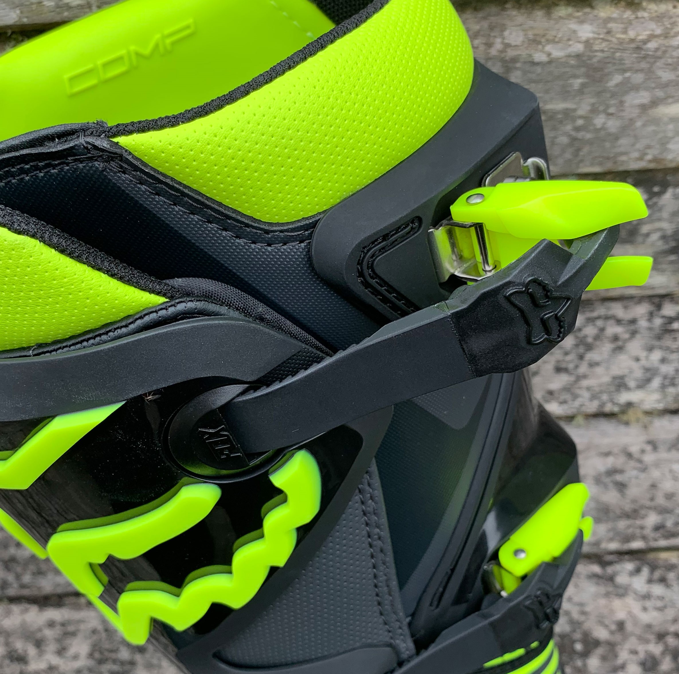 Contando com o já tradicional sistema de fechamento via presilhas e fechos, a Bota Fox Comp mescla as tecnologias já existentes em outros modelos, como o sistema multidirecional, que impede fechamentos incorretos em diferentes angulações.