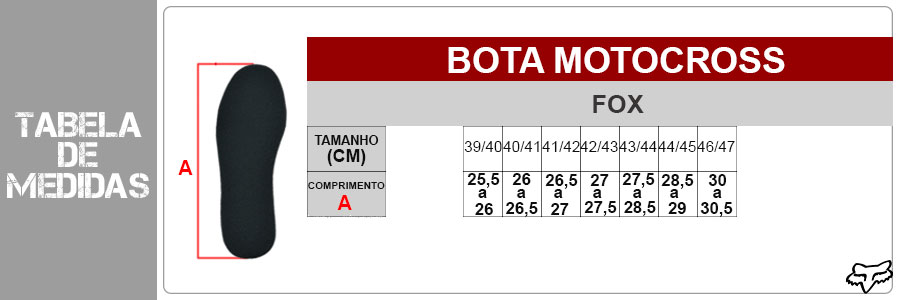 *As botas para motocross possuem ajuste mais preciso para melhor fixação junto aos pés. Por isso, recomenda-se a escolha de um número maior que o utilizado em calçados casuais.