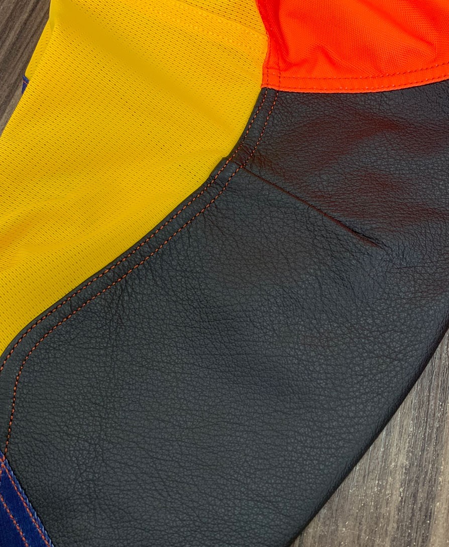 Os painéis em couro na parte interna dos joelhos favorecem a proteção contra atritos e contra o calor derivado das peças do motor e movimentações para ainda mais segurança.